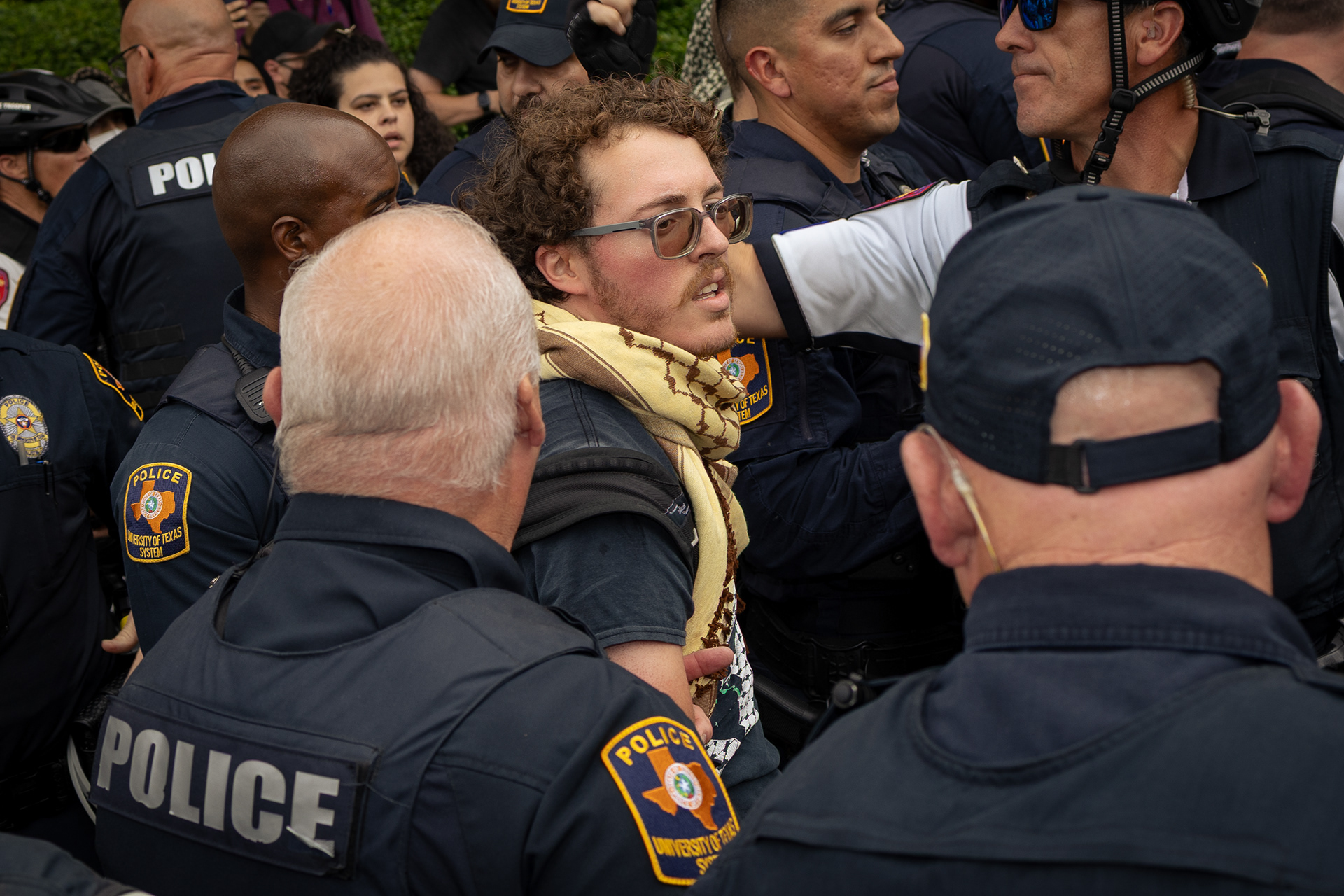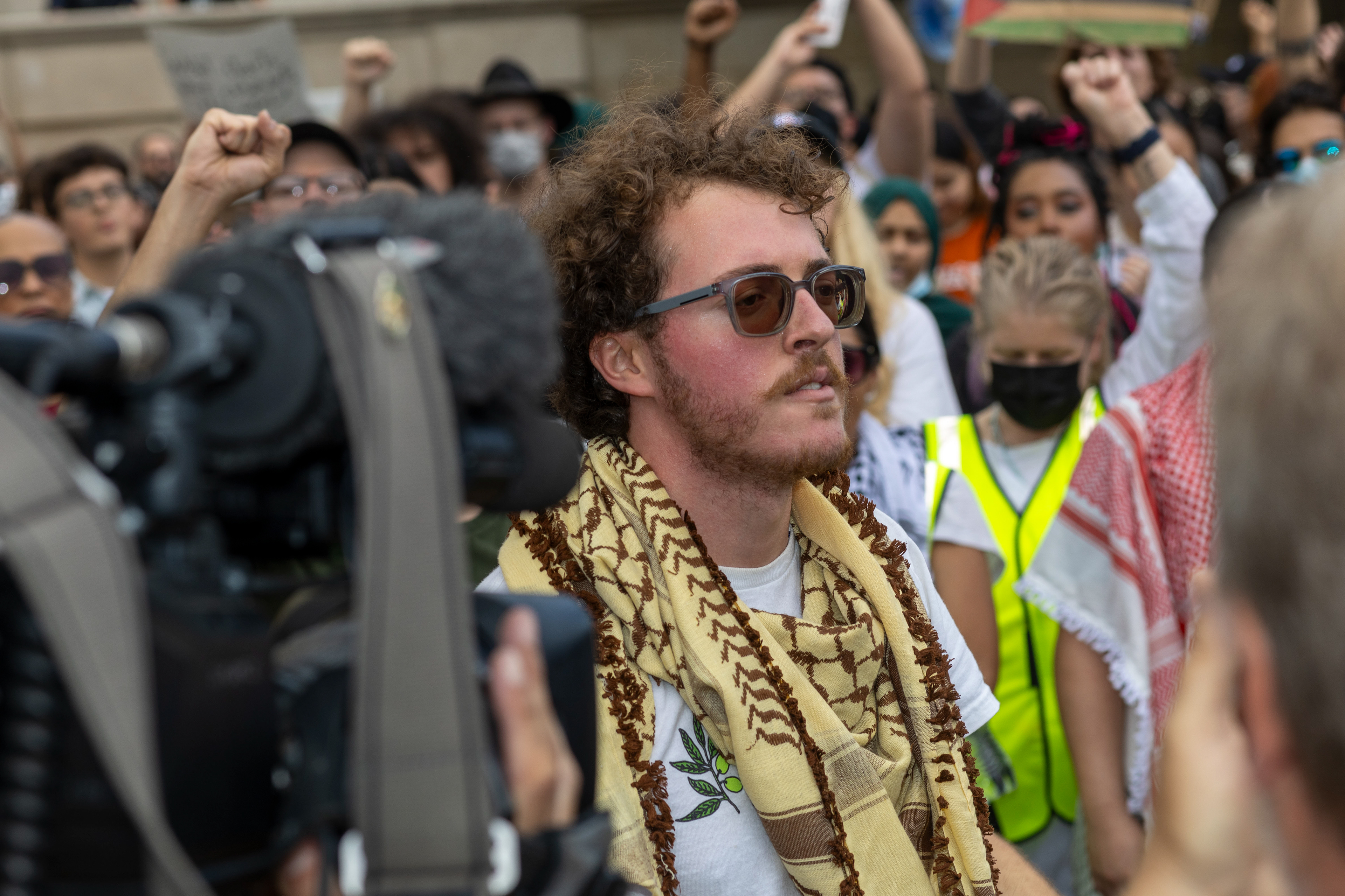 Rayan A., a student demonstrator of Palestinian-decent, holds the R in "cease fire" during the Israeli Block Party protest at The University of Texas on April 2, 2024.